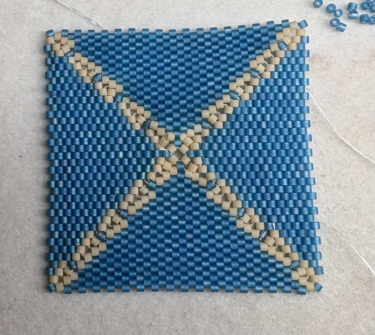 The rest of the square is easy compared to the start. Continue in peyote stitch and follow the pattern for the corner beads.